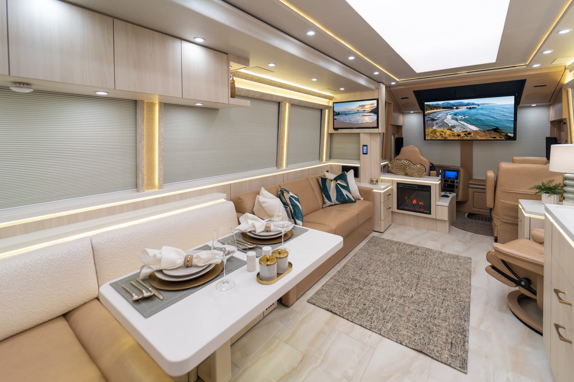 In the galley, you’ll find a chef inspired kitchen with custom refrigerator, induction cooktop, and convection microwave oven. Relax after a long day in the leather recliner enjoying one of the many tv’s inside the coach, or outside under the shady awning with the outdoor entertainment center.