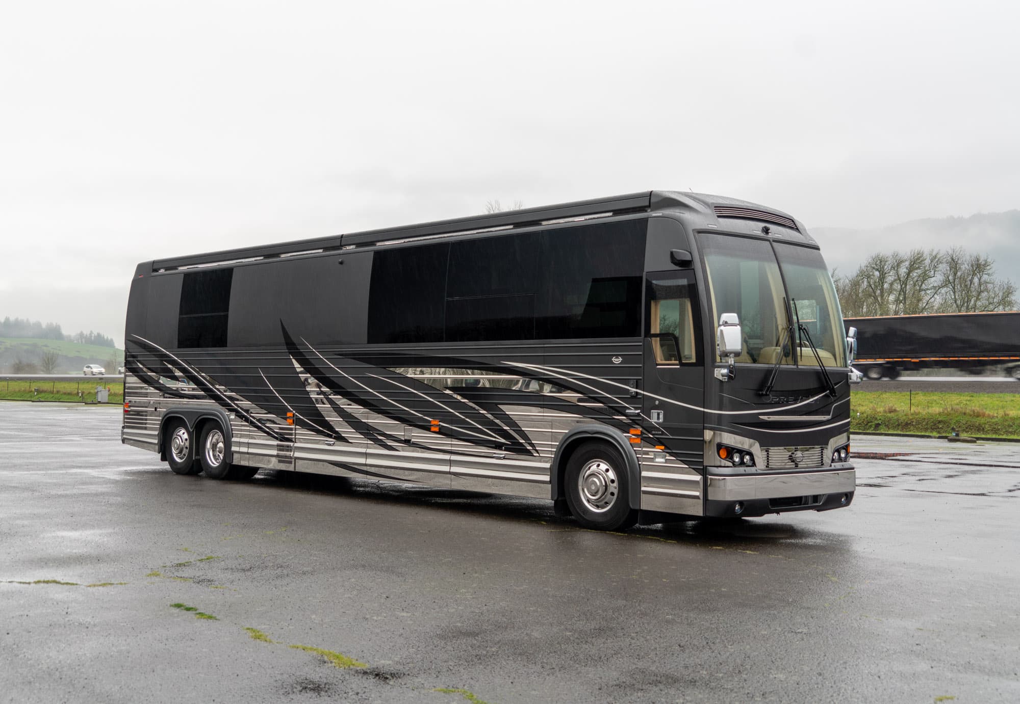 The future of luxury travel is here in the Prevost Marathon 1383 AB . This double slide coach is designed with every detail you would expect in a private penthouse apartment. Able to sleep six, this coach boasts a Master Suite with a king-sized bed and full bathroom that is accessible from the master suite, even with the privacy door closed. Additional sleeping arrangements include a set of bunk beds and futon style sofa in the salon.