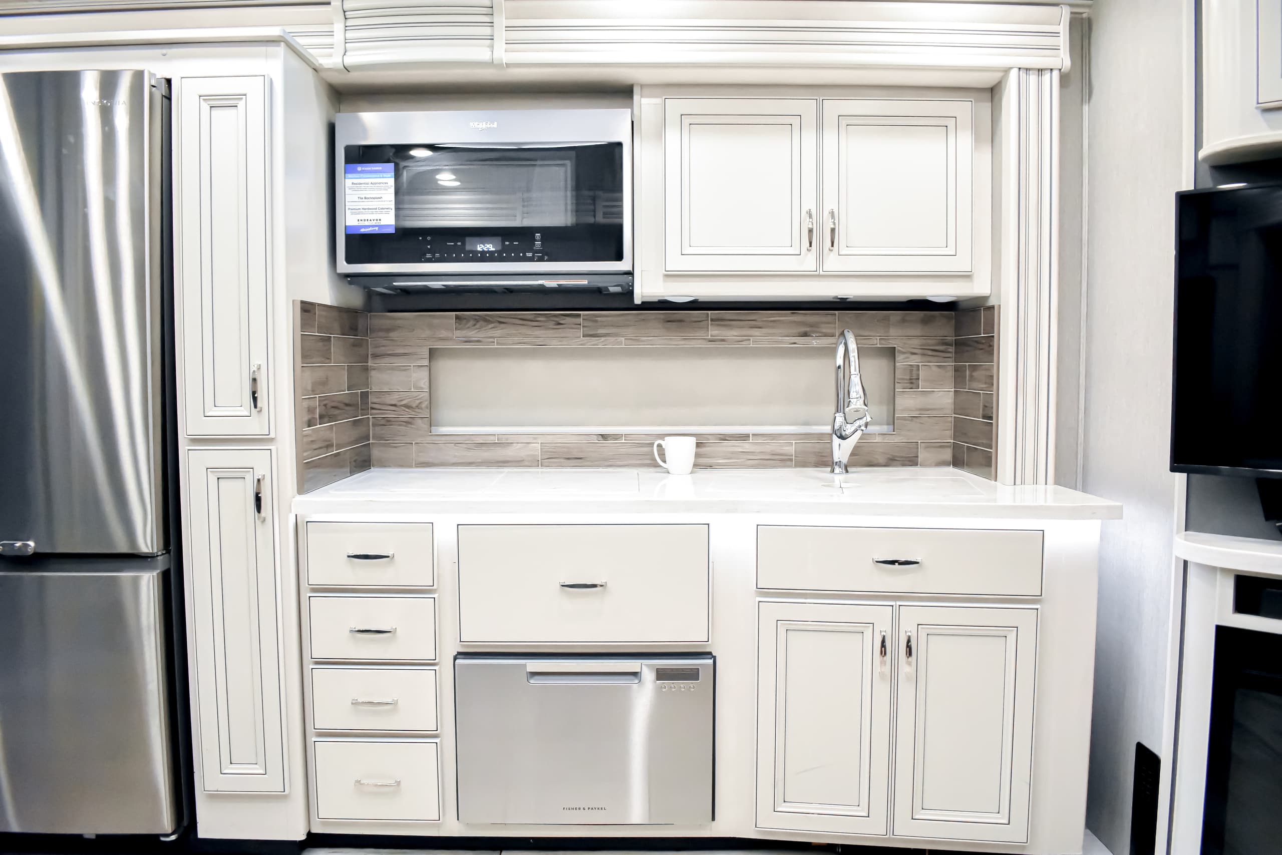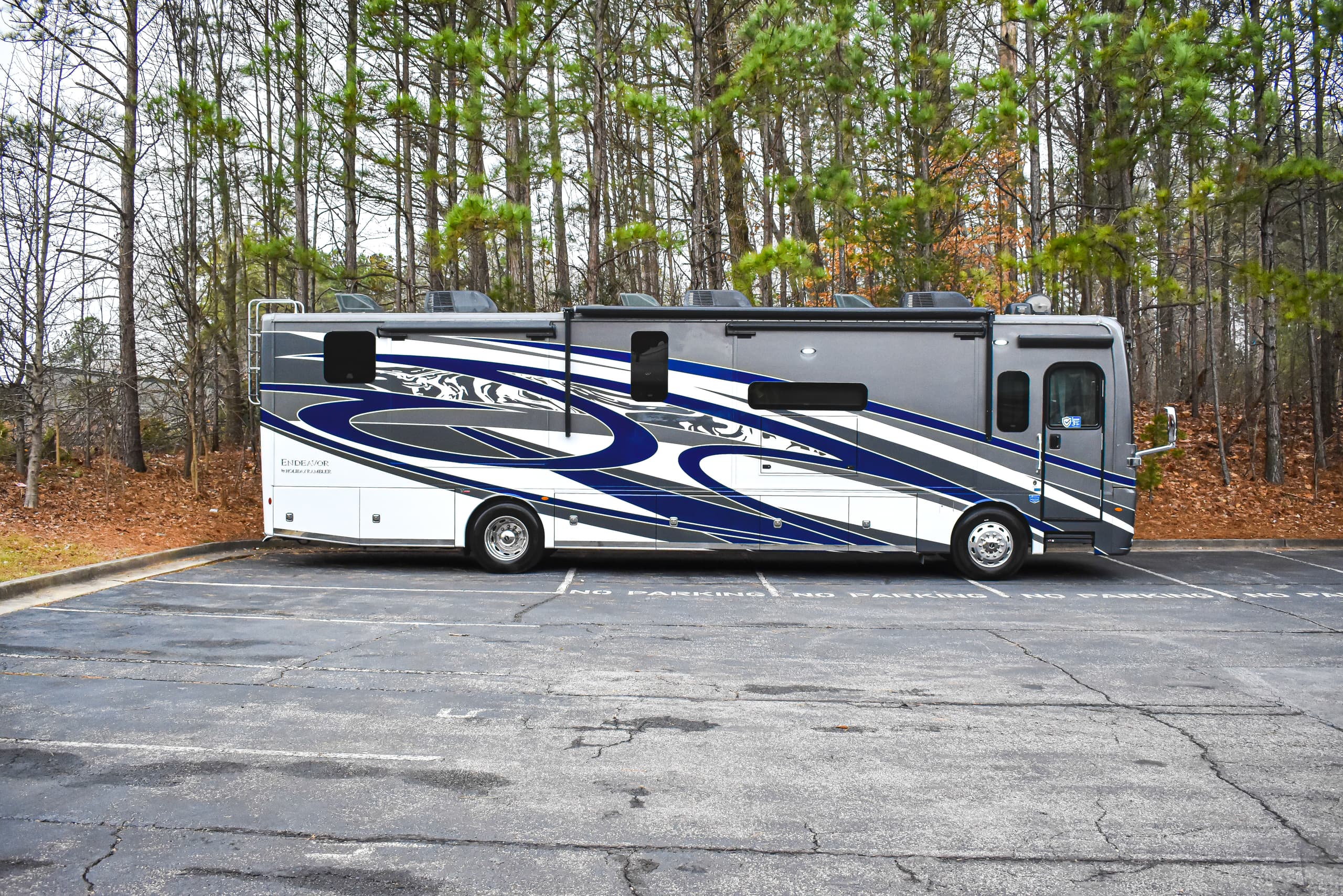 In the salon you will find a residential sized refrigerator, induction cooktop, convection microwave oven, and a premium leather dinette. Leading into the salon, you will be treated to a sleeper sofa opposed to two premium leather recliners with ottomans, and multiple entertainment systems. Enjoy the outdoor amenities this coach provides such as extended cargo and bay storage as well as an outdoor entertainment suite under a shady awning.
