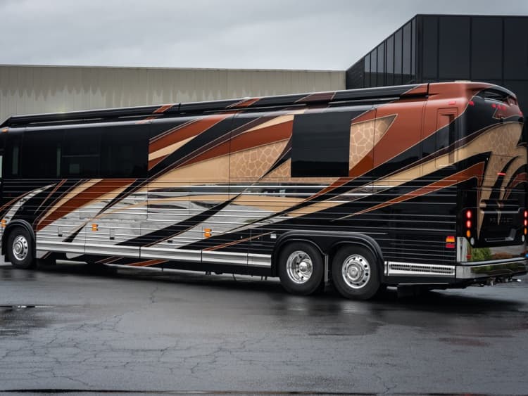 Enjoy a residential sized sub-zero fridge, stacked washer and dryer, induction cooktop, and convection microwave oven. You can relax inside in the leather recliner by one of the four TV’s powered by In-Motion satellite that keeps you entertained even when on the road. Experience luxury even outside by enjoying the outdoor entertainment suite under the shady awning.
